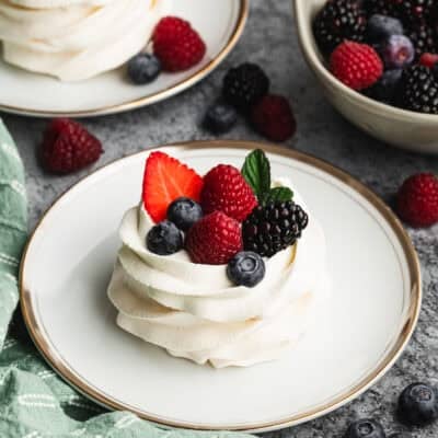 Mini Pavlovas are crisp on the outside with a soft center. They’re easy to customize and make a great light dessert.
