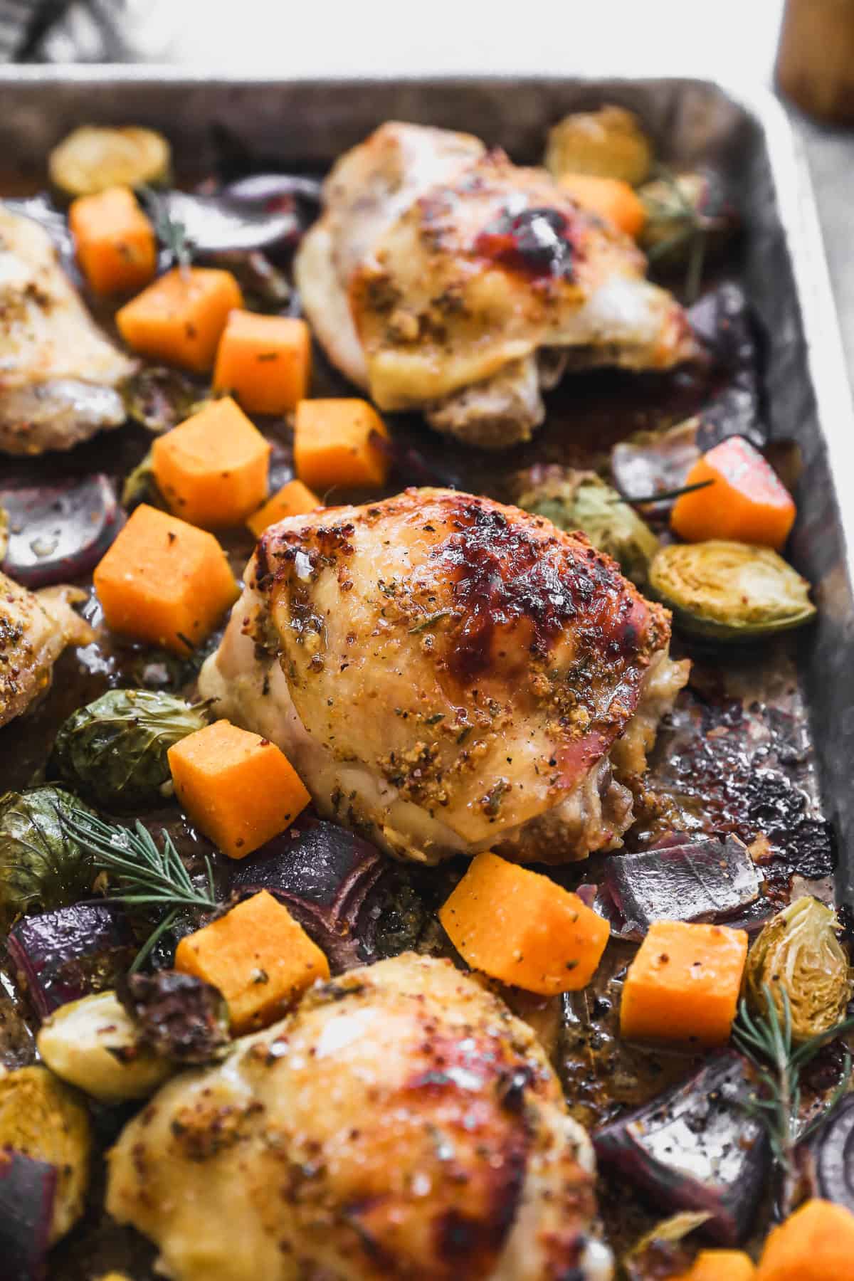 Honey Mustard Chicken is roasted on a sheet pan with butternut squash, red onion, and Brussels sprouts. This healthy and delicious dinner is ready in 30 minutes!