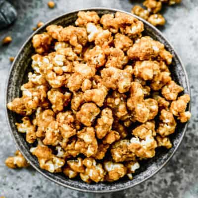 This homemade Caramel Popcorn recipe is so flavorful and has the crunchy, chewy texture you want without sticking to your fingers or teeth!