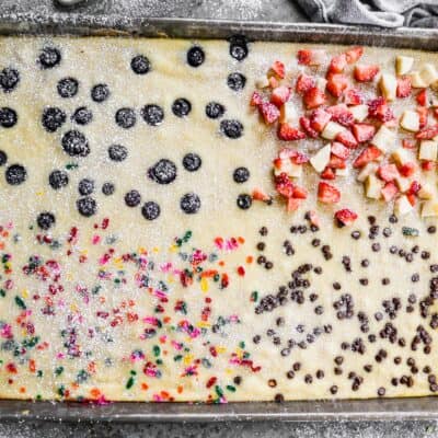 Sheet Pan Pancakes are a playful twist on traditional pancakes where everyone gets a topping they like! Pour the batter onto a sheet pan for square-shaped bites. Serve with Homemade Pancake Syrup.