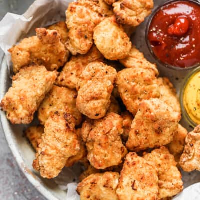 Using an air fryer to make chicken nuggets is the absolute answer to delicious crispy chicken without the extra calories and fat. (Highly recommend air fryer chicken tenders and air fryer wings, too!) The BEST!! My husband gets just as excited as the kids when I make these and I love that they're easy, healthier, and perfectly crispy and seasoned. I'll often load them on a big green salad, and my kids love them with a side of applesauce and veggies with hummus.