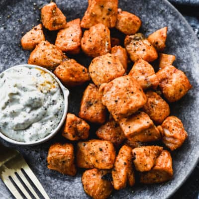You can totally make these without an air fryer! Just bake the seasoned salmon cubes on a parchment-lined sheet pan at 400°F for 10–12 minutes, flipping halfway through. They should be tender and flake easily when done. Everything else stays the same!! don’t skip that remoulade!