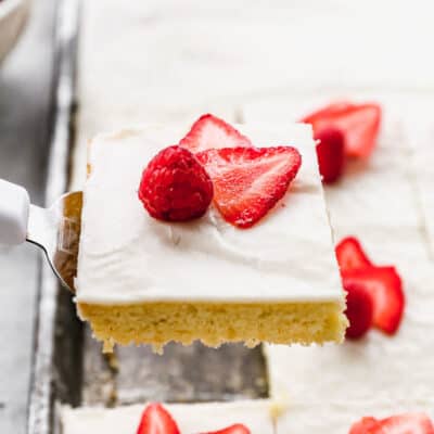 My Mother in Law's Chocolate Texas Sheet Cake is everyone in the family's favorite! A few years ago my Aunt prompted me to adapt that recipe into a white sheet cake, and since then, this has become our new favorite!