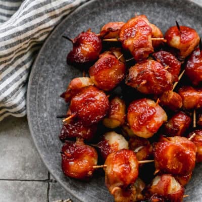 You can prep them (wrap them in bacon) and freeze them before baking! Just thaw overnight in the fridge before cooking. Leftovers can also be frozen, but they’ll reheat best in the oven to crisp the bacon back up.