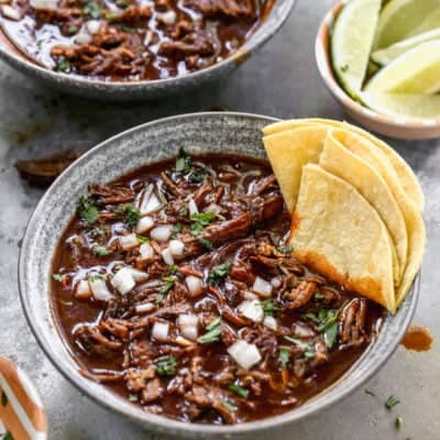 - Serve: Taste broth (careful, it’s hot!) and add additional seasonings or salt, if needed. Add some shredded meat to bowls and pour broth on top. Garnish with fresh chopped white onion and cilantro, and a squeeze of fresh lime juice. Serve with warm corn tortillas on the side, for dipping. Or, use the sauce and meat to make Birria Tacos!