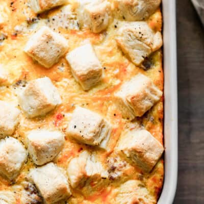 This easy Biscuits and Gravy Casserole recipe has a homemade sausage gravy baked with eggs and homemade biscuit dough. It's the ultimate make-ahead breakfast!