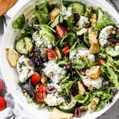 Our Burrata Salad recipe is as beautiful as it is delicious, made with tomatoes, cucumbers, burrata, and fresh herbs on a bed of mixed greens. It's topped with toasted pita and a simple lemon dressing, for the best 15 minute salad.