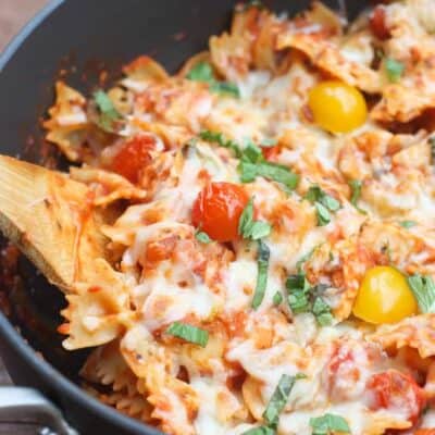 Warm and cheesy Chicken Mozzarella Pasta with Roasted Tomatoes is an easy, family-friendly pasta that takes less than 30 minutes to make!