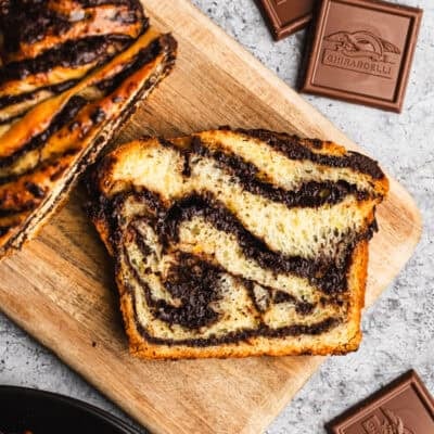 Allow the babka dessert to cool in the pan for 20-30 minutes, then remove to a wire cooling rack to cool completely. Use a sharp serrated knife to cut the loaf, wiping it clean between slices.