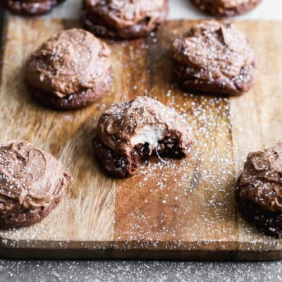 Make Cookie Dough: In a large mixing bowl, cream butter and sugar until light and fluffy. Mix in eggs and vanilla. Combine the flour, cocoa powder, baking soda, and salt in another bowl then pour into the wet mixture and stir only until combined. Scoop the cookie dough into rounded tablespoons onto a baking sheet lined with parchment paper.