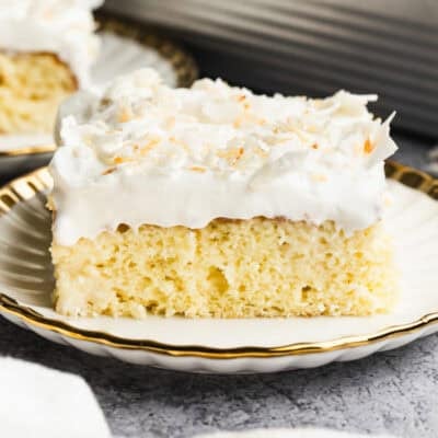 This Coconut Tres Leches Cake is a tropical twist on the classic, made with a light coconut sponge cake soaked in a rich blend of milks, topped with fluffy whipped cream and toasted coconut.
