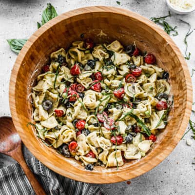 I love pasta salads that are easy to make, filling and full of fun flavors, and this Pesto Tortellini is all those things. It's delicious, and everyone always loves it! It tops the list of my favorite pasta salad recipes, along with this Spinach Avocado Pasta Salad and Teriyaki Bowtie Pasta Salad.