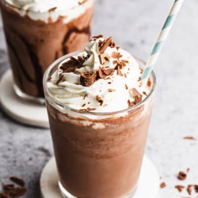 This Frozen Hot Chocolate recipe is my summer addiction! We blend real melted chocolate into this cool icy drink and finish it with a swirl of whipped cream, all ready in 15 minutes.