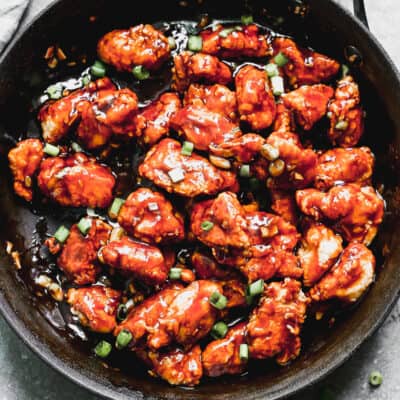 Serve this easy General Tso Chicken recipe with white or brown rice (or for some Pan-Asian fusion, Kimchi Fried Rice) garnished with green onions and/or sesame seeds.
