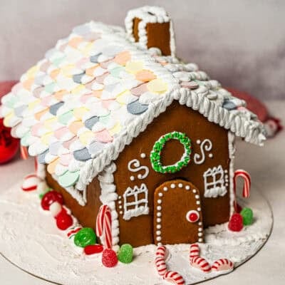 Finish Frosting: Add powdered sugar and cream of tartar and beat the frosting until smooth and has standing peaks (4-6 minutes). Use to decorate your gingerbread house or even to hold it together!