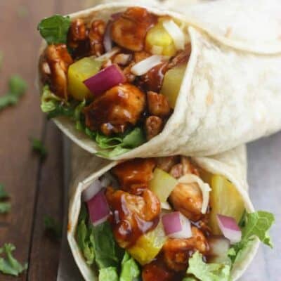 Let me tell you, these Hawaiian BBQ Chicken Wraps are just as delicious as they look. You can make your bbq sauce from scratch, or use your favorite bottled kind. I prefer Sweet Baby Rays Original BBQ Sauce. You can have these wraps made from fridge to table in 20 minutes or less. Perfect for an easy weeknight meal or even for lunch.