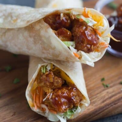 I kept this recipe pretty simple because they crispy baked chicken smothered in BBQ sauce is the real star of the wrap. I added some coleslaw for crunch and flavor and the end result was completely DELICIOUS!