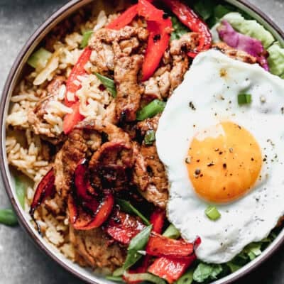 One pan, nutritious Korean Bulgogi Bowls (bibimbap) consist of thin strips of marinated pork, chicken, beef or tofu served over kimchi fried rice with leafy greens and a fried egg on top. This dish is packed with flavor and absolutely delicious!