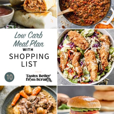 A 5 day LOW CARB MEAL PLAN with easy and healthy low carb dinner options and a free grocery shopping list; perfect for cooking on a budget. This week’s menu includes our popular Applebees Chicken Salad (with grilled chicken), Turkey Chili, Pot Roast, Black Bean Burger (lettuce wrapped) and BBQ Chicken Wrap (with low carb tortilla).