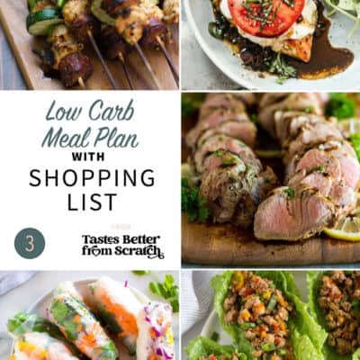 A 5 day LOW CARB MEAL PLAN with easy and healthy low carb dinner options and a free grocery shopping list; perfect for cooking on a budget. This week’s menu includes our popular Pork Tenderloin, Turkey Lettuce Wraps, Chicken Caprese, Cajun Chicken and Sausage Kebobs and Spring Rolls.