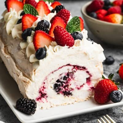 I promise you Meringue Roulade is a show-stopping dessert that ANYONE can make! It's similar to pavlova with a light, marshmallow-like texture and a slightly crispy exterior, but we make it more like a swiss cake roll, with whipped cream and berries inside. My 8-year-old proclaimed this the best dessert of all time! I love how effortless it is to make beautiful, with just whipped cream and berries on top.