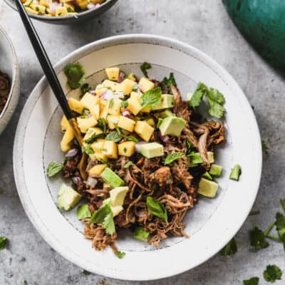 These Mojo Pork Bowls have shredded tender and flavorful mojo pork on a bed of seasoned black beans and topped with avocado, mango salsa, and fresh herbs. The pork is easy to make and can be cooked in a slow cooker or in the oven.