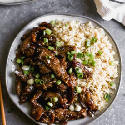 This easy Mongolian Beef recipe is inspired by my favorite takeout dish. Tender beef and fresh green onions in an amazing garlic and ginger sauce, served over hot cooked rice, and ready in 30 minutes.