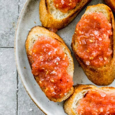 In the Catalonia region of Spain, the authentic way to make it is by generously rubbing the flesh of a peñar or azucar tomato all over toasted garlic bread, then drizzle with EVOO and a crack of sea salt. But our family loves the tomato topping so much that we like to grate the tomato flesh into a bowl and drizzle with EVOO and a pinch of sea salt, so that we can add a big scoop of this tomato mixture onto toasted garlic bread. DELICOUS!