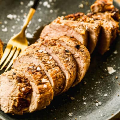 Cook pork tenderloin: Preheat oven to 325 degrees F. Heat a grill (or grill pan or cast iron skillet on the stove) over high heat. Remove pork from marinade and place on hot grill. Sear over high heat, rotating the meat until well browned on all sides. Add to a baking dish, cover with aluminum foil and bake for 18-25 minutes (145° F – 160° F, depending on how well done you like your pork). Rest for 10 minutes before carving.