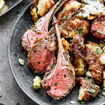 Rest and Serve: Transfer lamb to a cutting board and tent with a piece of foil. Let it rest for 15 minutes. During that time, place potatoes back in oven until crispy (about 10 more minutes). Slice the lamb in between the bones then arrange on a serving platter with potatoes.