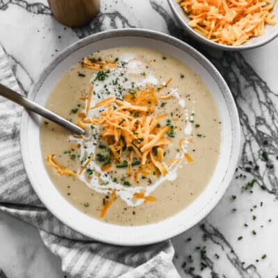 Sure! To make this roasted cauliflower soup in the crock pot, start by roasting the cauliflower and garlic as directed—don’t skip this step, it adds a ton of flavor. Sauté the onion in butter for a few minutes, then add it to the crock pot along with the roasted cauliflower, squeezed roasted garlic, broth, thyme, red pepper flakes, salt, and pepper. Cook everything on low for 4–6 hours or high for 2–3 hours. When it’s done, blend the soup until smooth, then stir in the cream and nutmeg and season to taste. Finish with your favorite toppings like cheddar, chives, and a drizzle of cream!