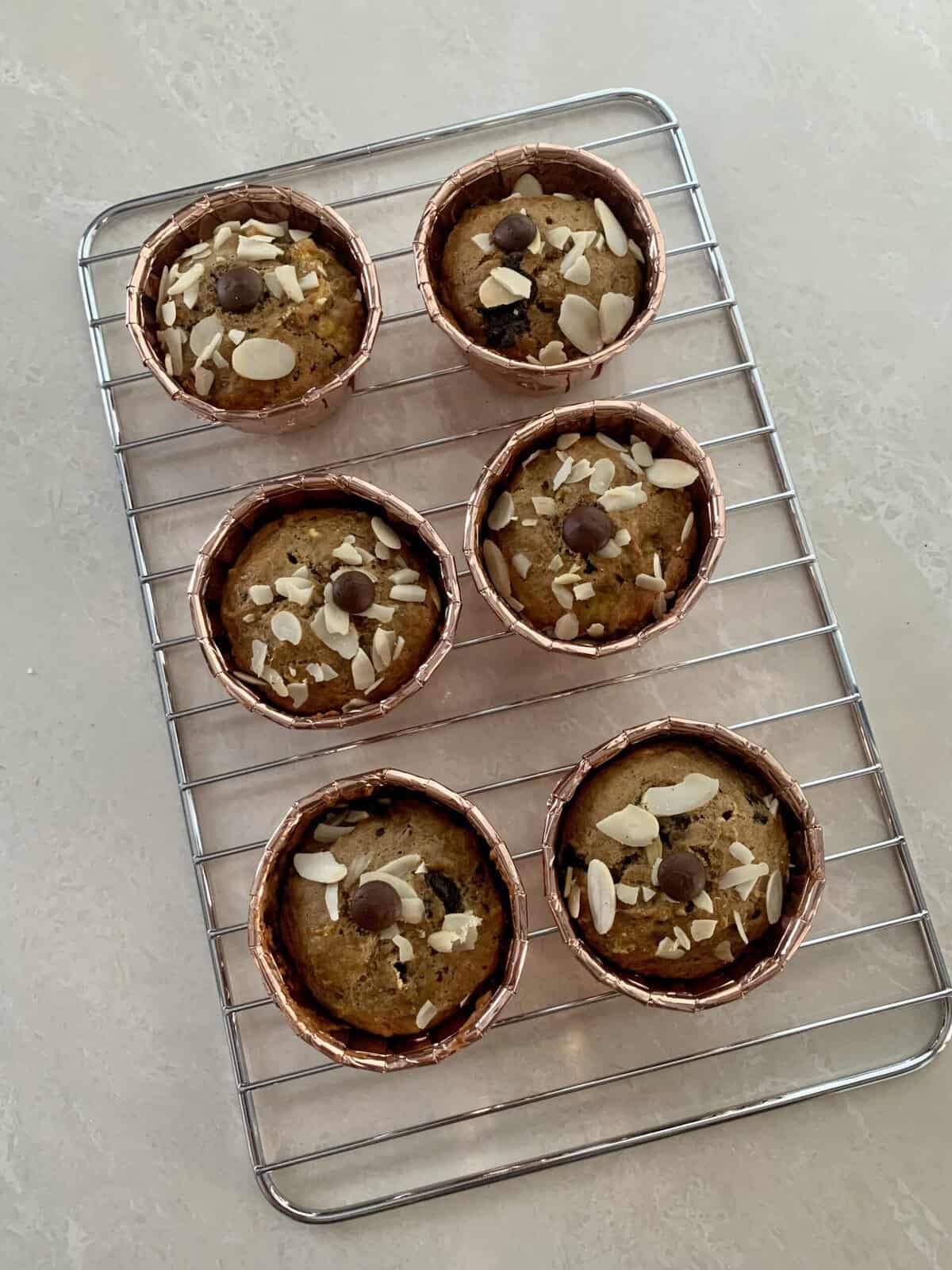 Bake: Spoon the batter into prepared muffin pan then bake these healthy banana bread muffins for 18-25 minutes. Makes 12 muffins.