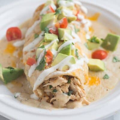 We love to top the burritos with fresh diced avocados and tomatoes. You can serve them with a side of my favorite authentic Mexican rice and semi-homemade refried beans or a simple green salad.