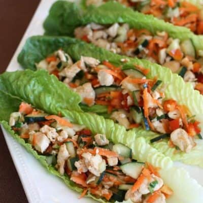 These healthy and Spicy Chicken Lettuce Wraps are filled with a chicken mixture of cucumbers, carrots, bell peppers, green onions, cilantro, and cashews.