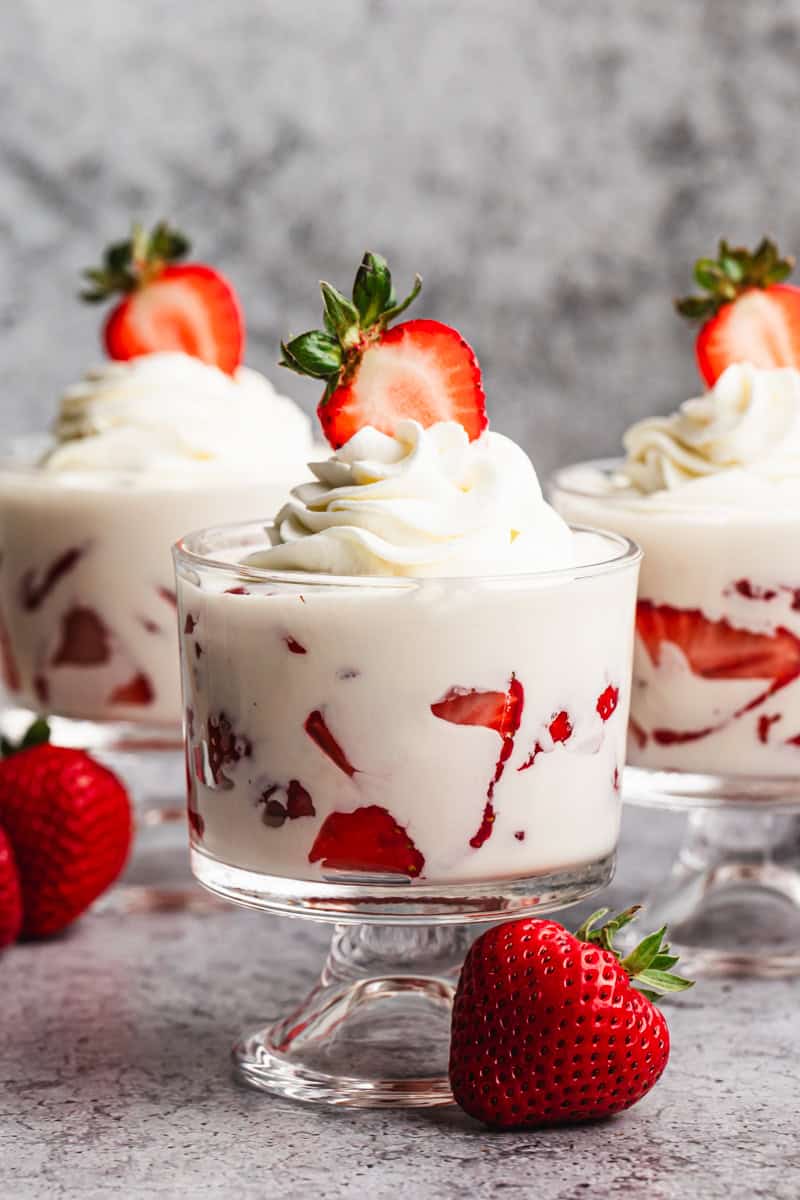 Assemble: Scoop some strawberries into a cup with a spoon then pour ½ cup of the cream mixture over the top. Serve with whipped cream on top, if desired!
