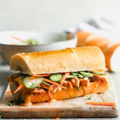 This delicious Vietnamese inspired Bánh Mì sandwich recipe is bursting with fresh and bold flavor from pickled veggies, seasoned chicken and homemade sauce. It's fun and inexpensive to make from home.