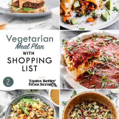 A 5 day Vegetarian Meal Plan with easy and healthy vegetarian dinner options and a free grocery shopping list; perfect for cooking on a budget. This week's menu includes our popular spaghetti pie, black bean burger, spring roll bowl, vegetarian enchiladas, and creamy pesto tortellini.
