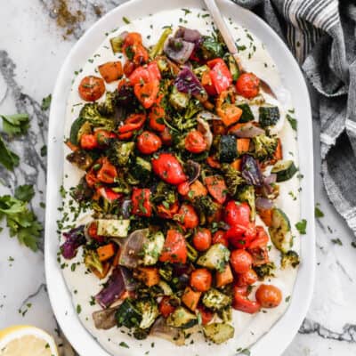 To Make Ahead: The whipped feta recipe can be made up to 3 days in advance then kept in an airtight container in the fridge. The vegetables can be chopped and kept in the fridge until ready to roast and serve.