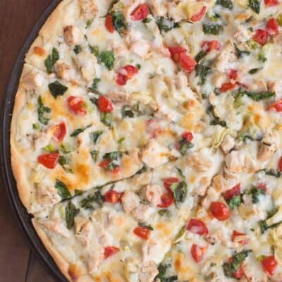 The artichoke addition is my favorite. I also decided to add chicken because we love grilled chicken on our pizza and it adds extra heartiness and protein. You can definitely leave out the chicken if you want a vegetarian pizza.