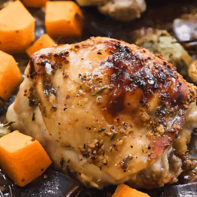 This Honey Mustard Chicken is juicy, flavorful, and smothered in a sweet and tangy sauce that’s made with pantry staples. It bakes all in one pan- making dinner feel effortless and cleanup even easier.